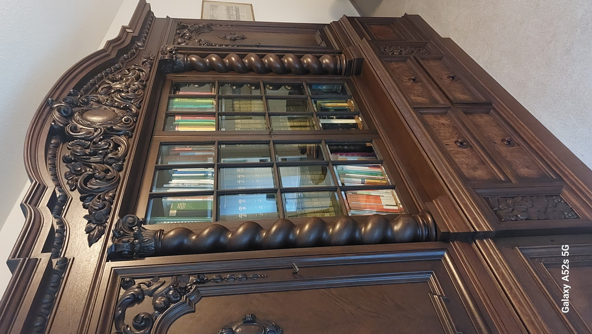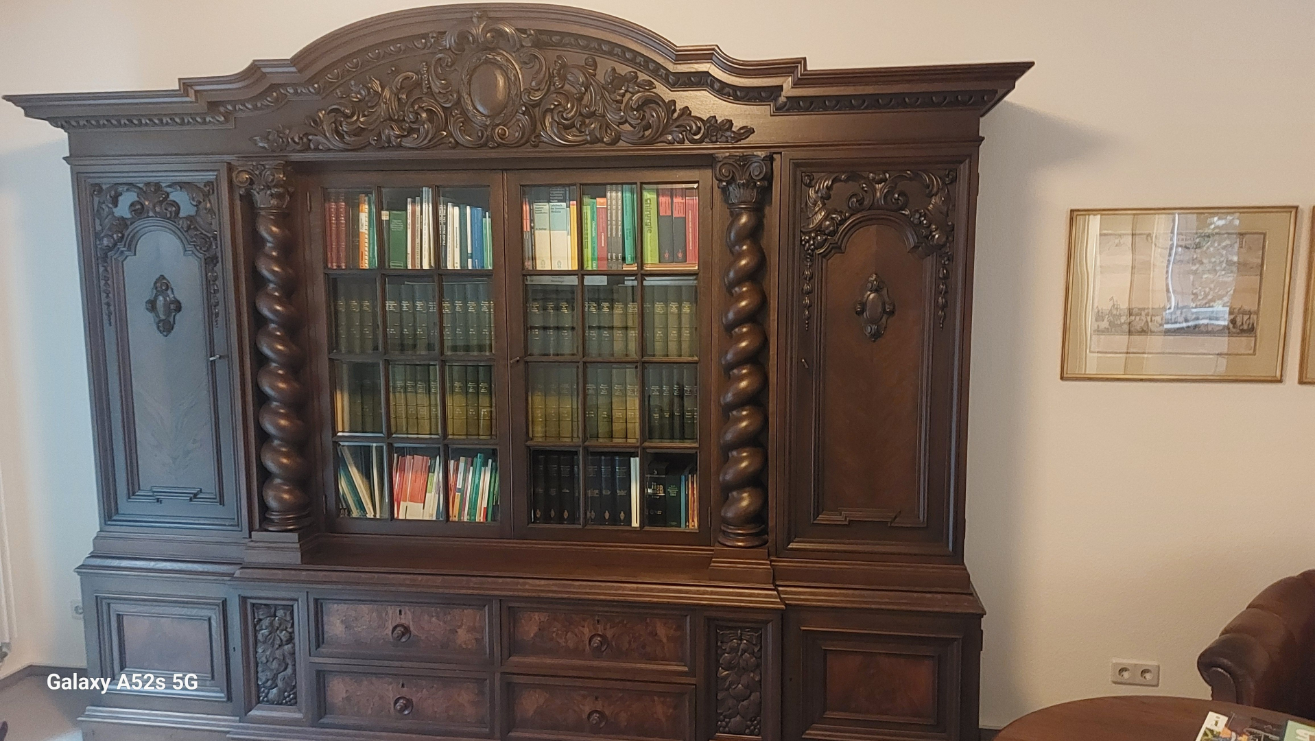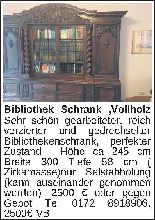 Sehr schön gearbeiteter, reich verzierter und gedrechselter Bibliothekenschrank, perfekter Zustand Höhe ca 245 cm Breite 300 Tiefe 58 cm ( Zirkamasse)nur Selstabholung (kann auseinander genommen werden) 2500 € oder gegen Gebot Tel 0172 8918906Kontakt