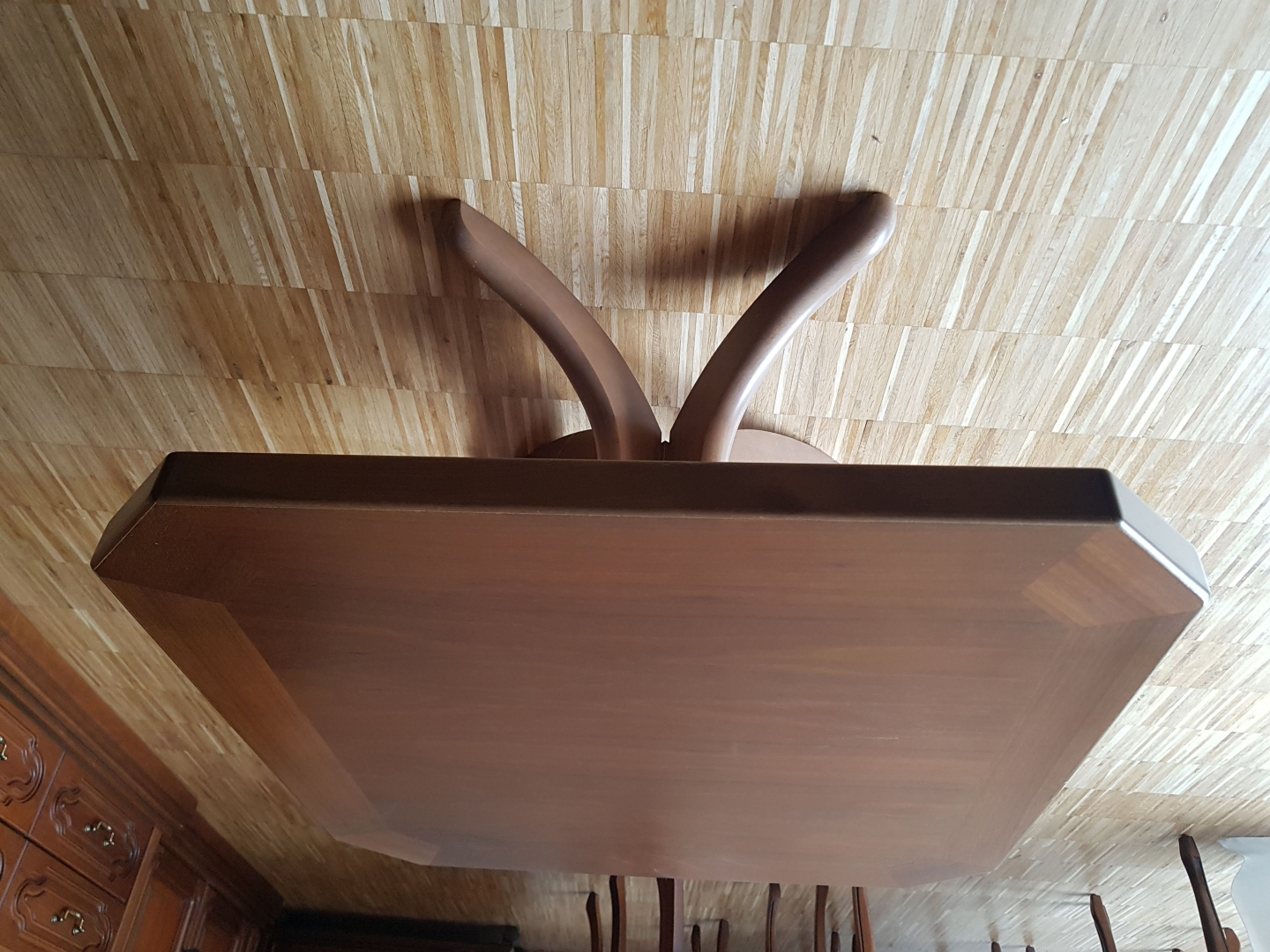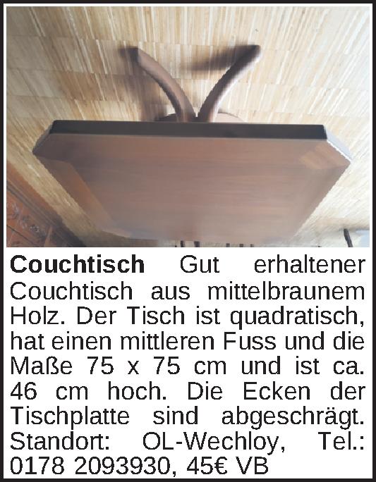Gut erhaltener Couchtisch aus mittelbraunem Holz.Der Tisch ist quadratisch, hat einen mittleren Fuss und die Maße 75 x 75 cm und ist ca. 46 cm hoch. Die Ecken der Tischplatte sind abgeschrägt.