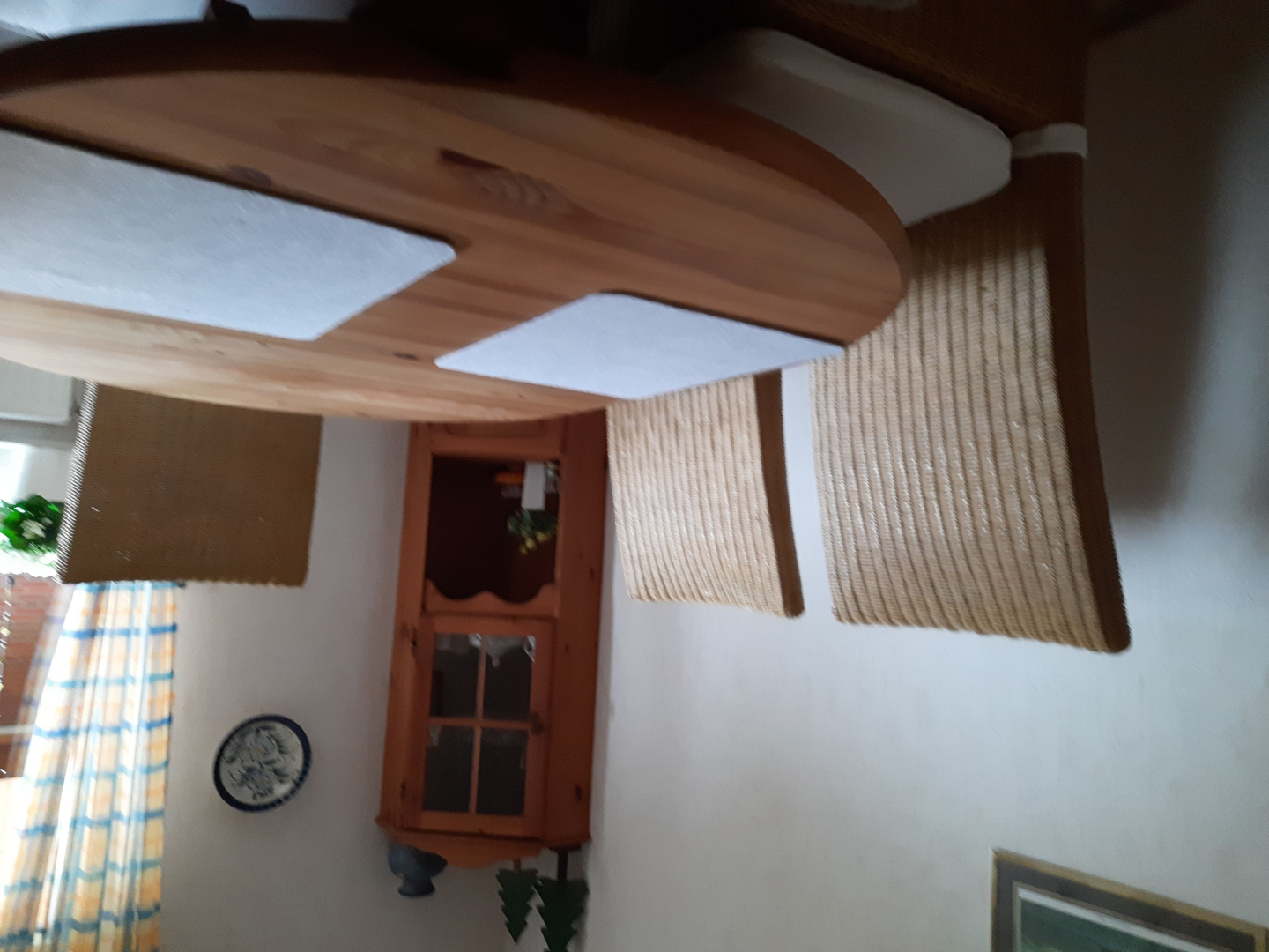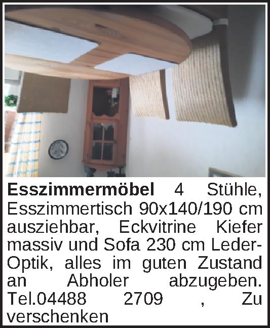 4 Stühle, Esszimmertisch 90x140/190 cm ausziehbar, Eckvitrine Kiefer massiv und Sofa 230 cm Leder-Optik, alles im guten Zustand an Abholer abzugeben. Tel.04488 2709