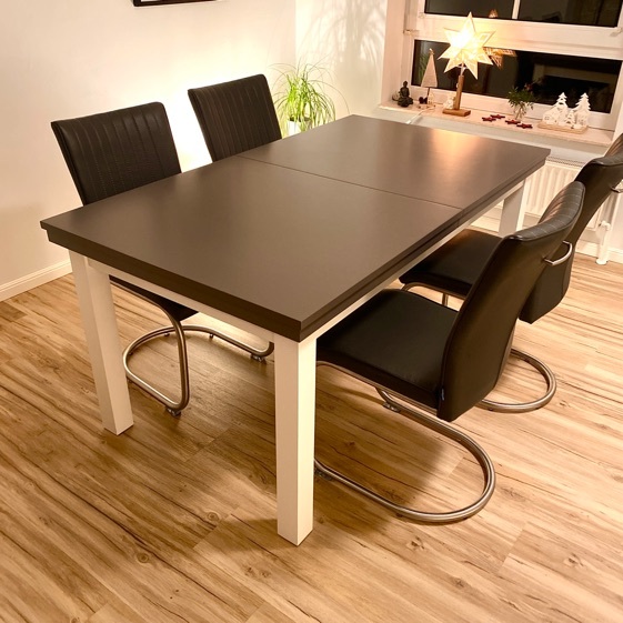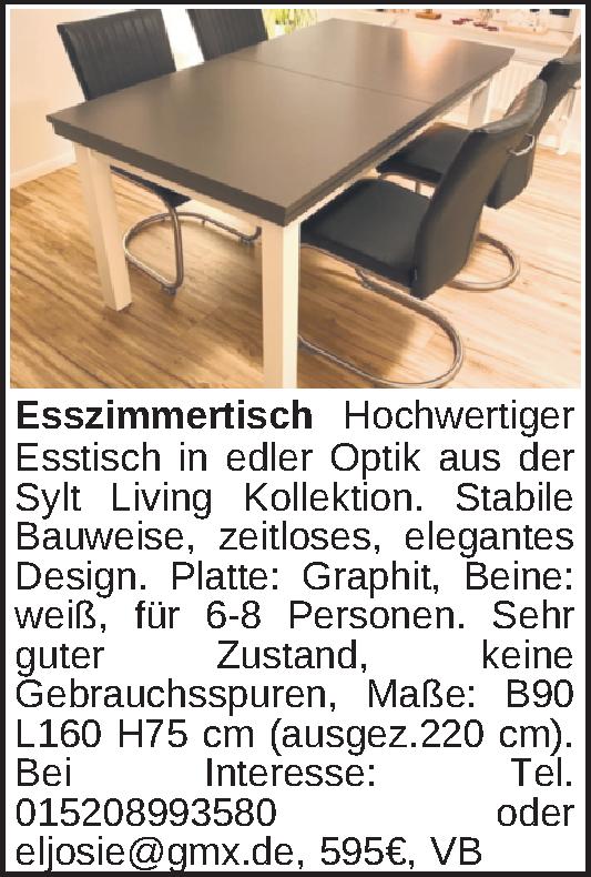 Hochwertiger Esstisch in edler Optik aus der Sylt Living Kollektion. Stabile Bauweise, zeitloses, elegantes Design. Platte: Graphit, Beine: weiß, für 6-8 Personen. Sehr guter Zustand, keine Gebrauchsspuren, Maße: B90 L160 H75 cm (ausgez.220 cm). Bei