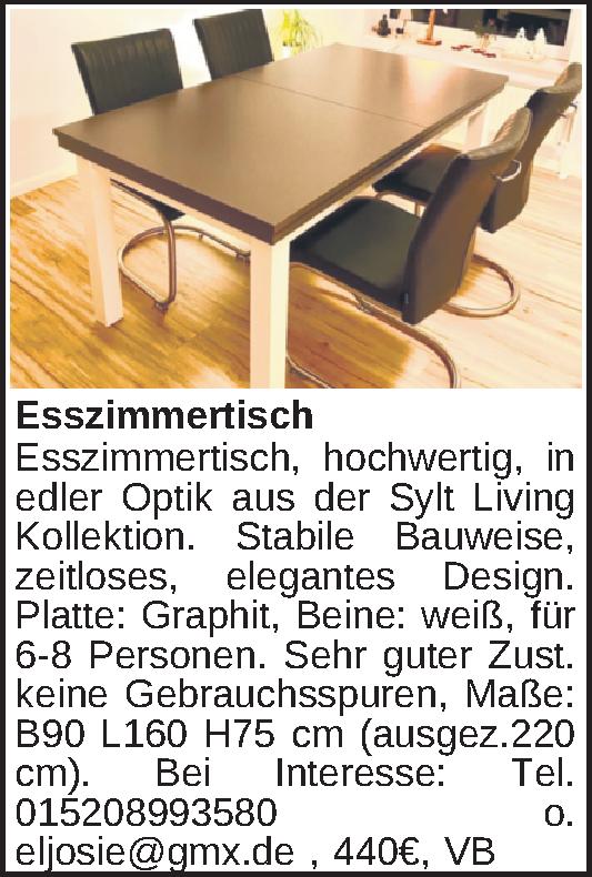 Esszimmertisch, hochwertig, in edler Optik aus der Sylt Living Kollektion. Stabile Bauweise, zeitloses, elegantes Design. Platte: Graphit, Beine: weiß, für 6-8 Personen. Sehr guter Zust. keine Gebrauchsspuren, Maße: B90 L160 H75 cm (ausgez.220 cm). BKontakt