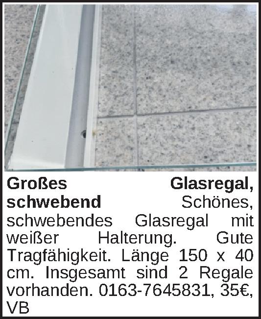 Schönes, schwebendes Glasregal mit weißer Halterung. Gute Tragfähigkeit. Länge 150 x 40 cm. Insgesamt sind 2 Regale vorhanden.0163-7645831