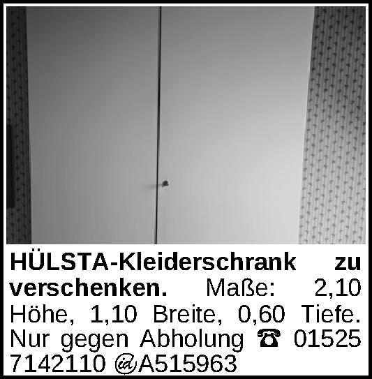 zu verschenken. Maße: 2,10 Höhe, 1,10 Breite, 0,60 Tiefe. Abholung in Wahnbek. Tel.:01525 7142110Kontakt