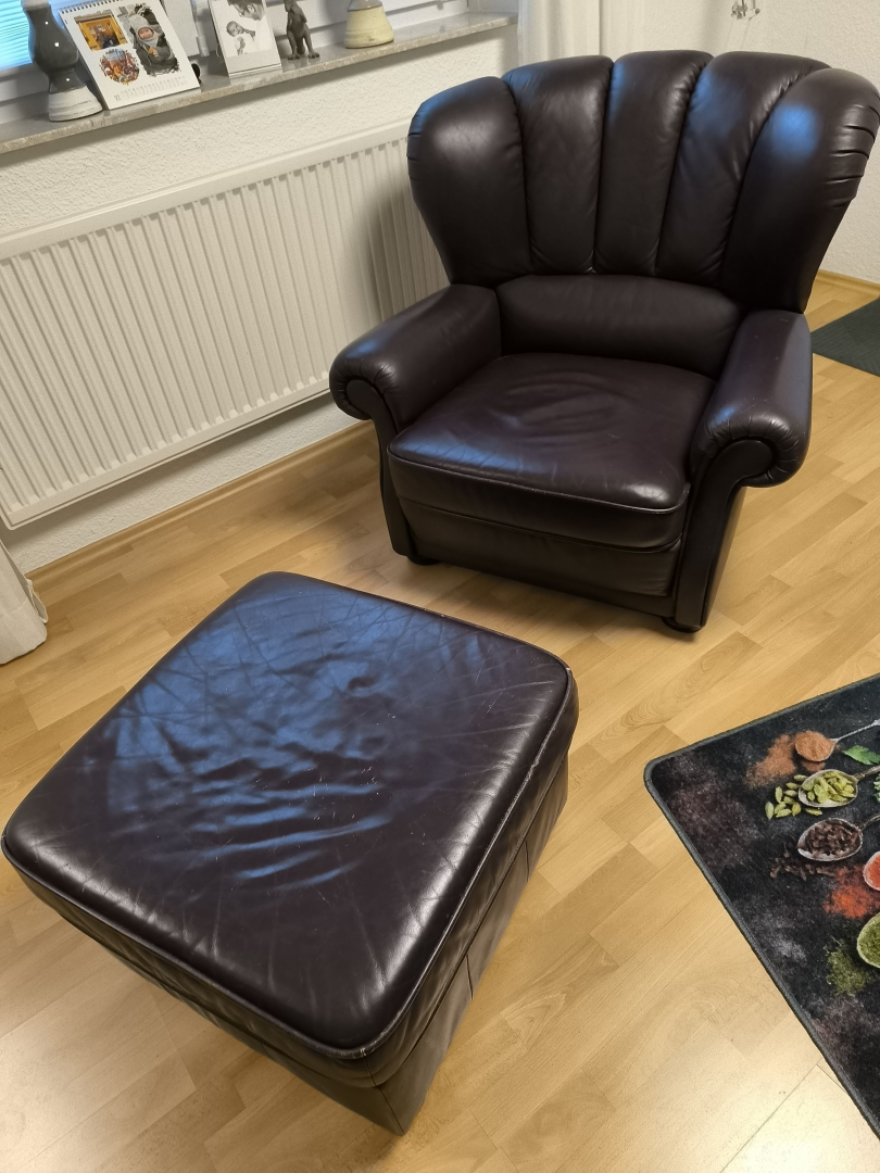 Anzeigentitel: Ledersessel mit Lederhocker