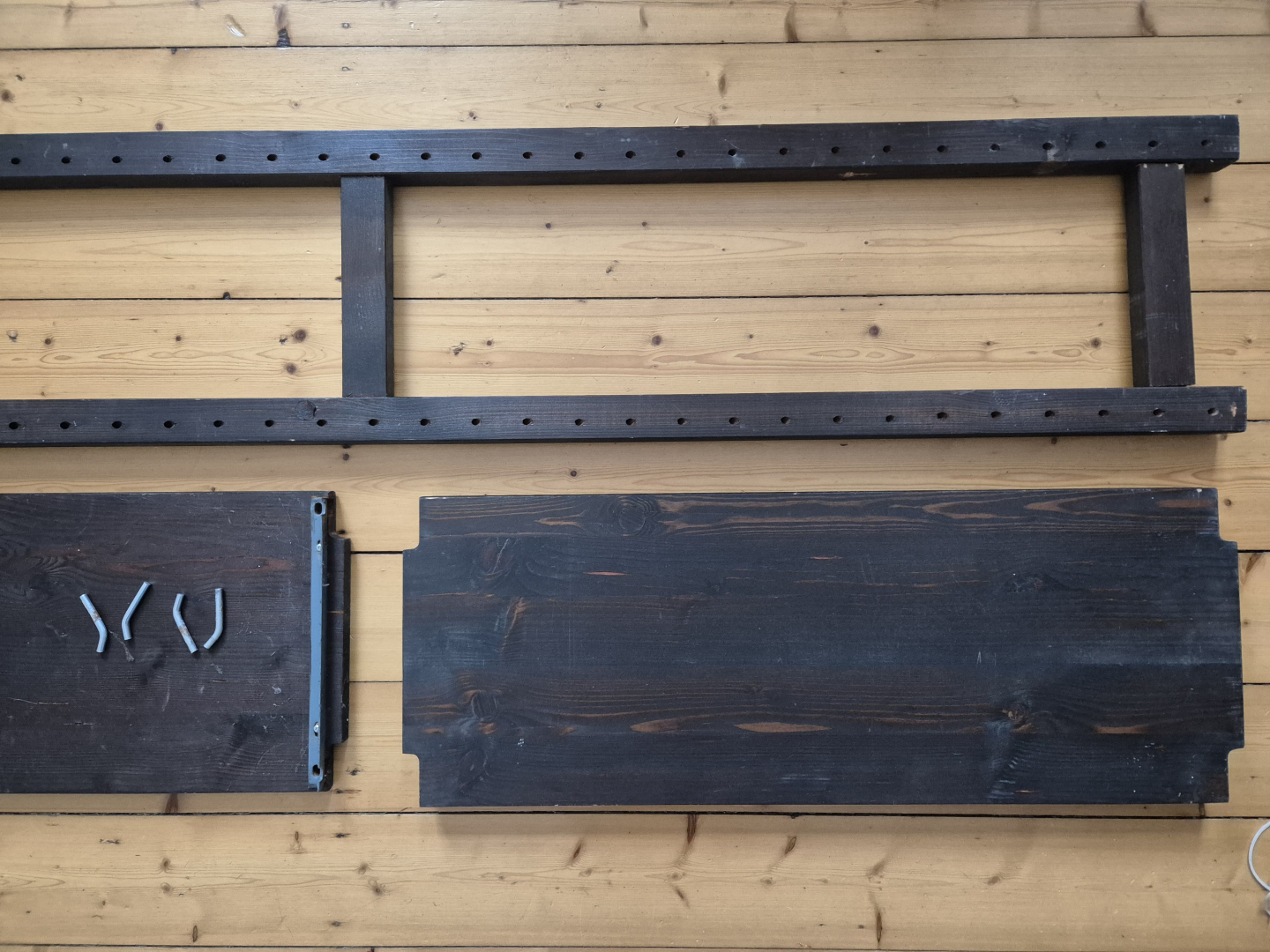 braun gebeizt, sehr belastbar durch Schräglochung, verstellbar alle 5 cmTiefe 30 cm, Höhe 208 cm, 6 Leitern,
