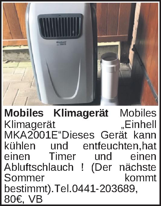 Mobiles Klimagerät „Einhell MKA2001E“Dieses Gerät kann kühlen und entfeuchten,hat einen Timer und einen Abluftschlauch ! (Der nächste Sommer kommt bestimmt).Tel.0441-203689Kontakt