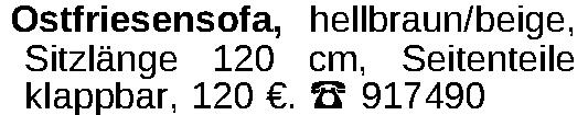 Ostfriesensofa, hellbraun/beige, Sitzlänge 120 cm, Seitenteile klappbar, 120 €. ‡ 917490Kontakt