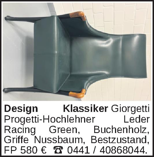 Design Klassiker Giorgetti Progetti-Hochlehner Leder Racing Green, Buchenholz, Griffe Nussbaum, Bestzustand, FP 580 € ‡ 0441 / 40868044.Kontakt