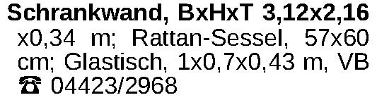 Schrankwand, BxHxT 3,12x2,16 x0,34 m; Rattan-Sessel, 57x60 cm; Glastisch, 1x0,7x0,43 m, VB 04423/2968