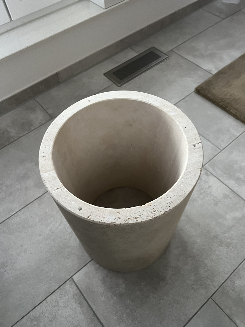 Der Tisch und der ebenfalls runde Fuß bestehen aus Travertin und sind gut erhalten. Der Durchmesser der Tischplatte beträgt ca. 60cm und der Tisch ist ca. 45 cm hoch. Aufgrund des Materials ist er sehr schwer.