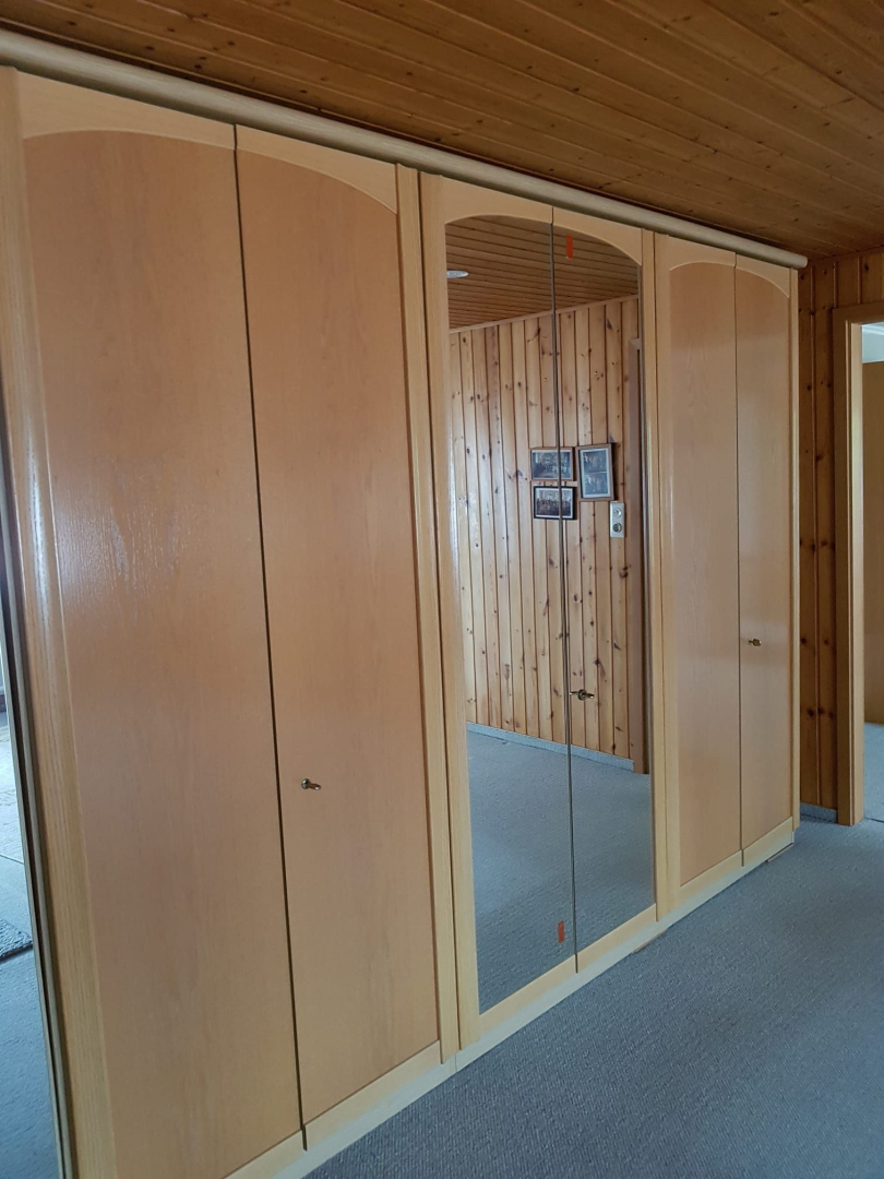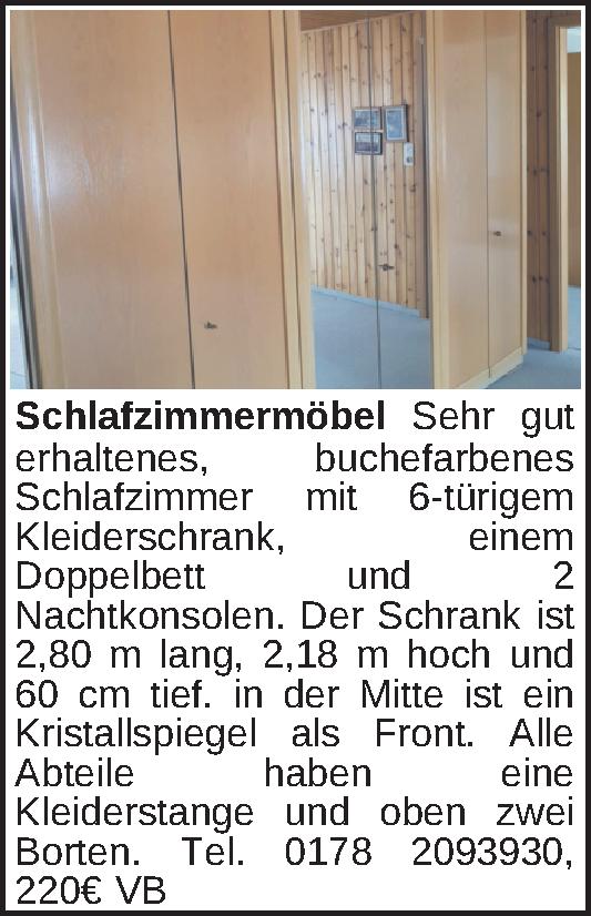 Sehr gut erhaltenes, buchefarbenes Schlafzimmer mit 6-türigem Kleiderschrank, einem Doppelbett und 2 Nachtkonsolen. Der Schrank ist 2,80 m lang, 2,18 m hoch und 60 cm tief. in der Mitte ist ein Kristallspiegel als Front. Alle Abteile haben eine KleidKontakt