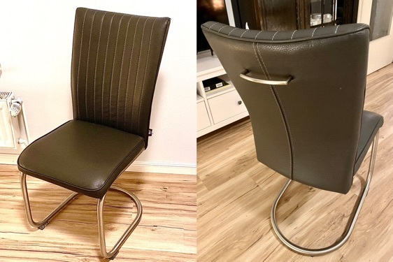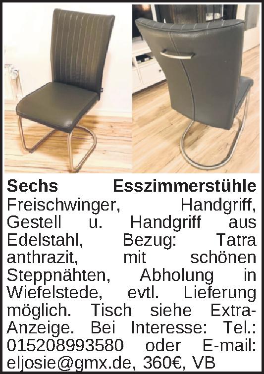 Freischwinger, Handgriff, Gestell u. Handgriff aus Edelstahl, Bezug: Tatra anthrazit, mit schönen Steppnähten, Abholung in Wiefelstede, evtl. Lieferung möglich.Tisch siehe Extra-Anzeige. Bei Interesse: Tel.: 015208993580 oder E-mail: eljosie@gmx.de