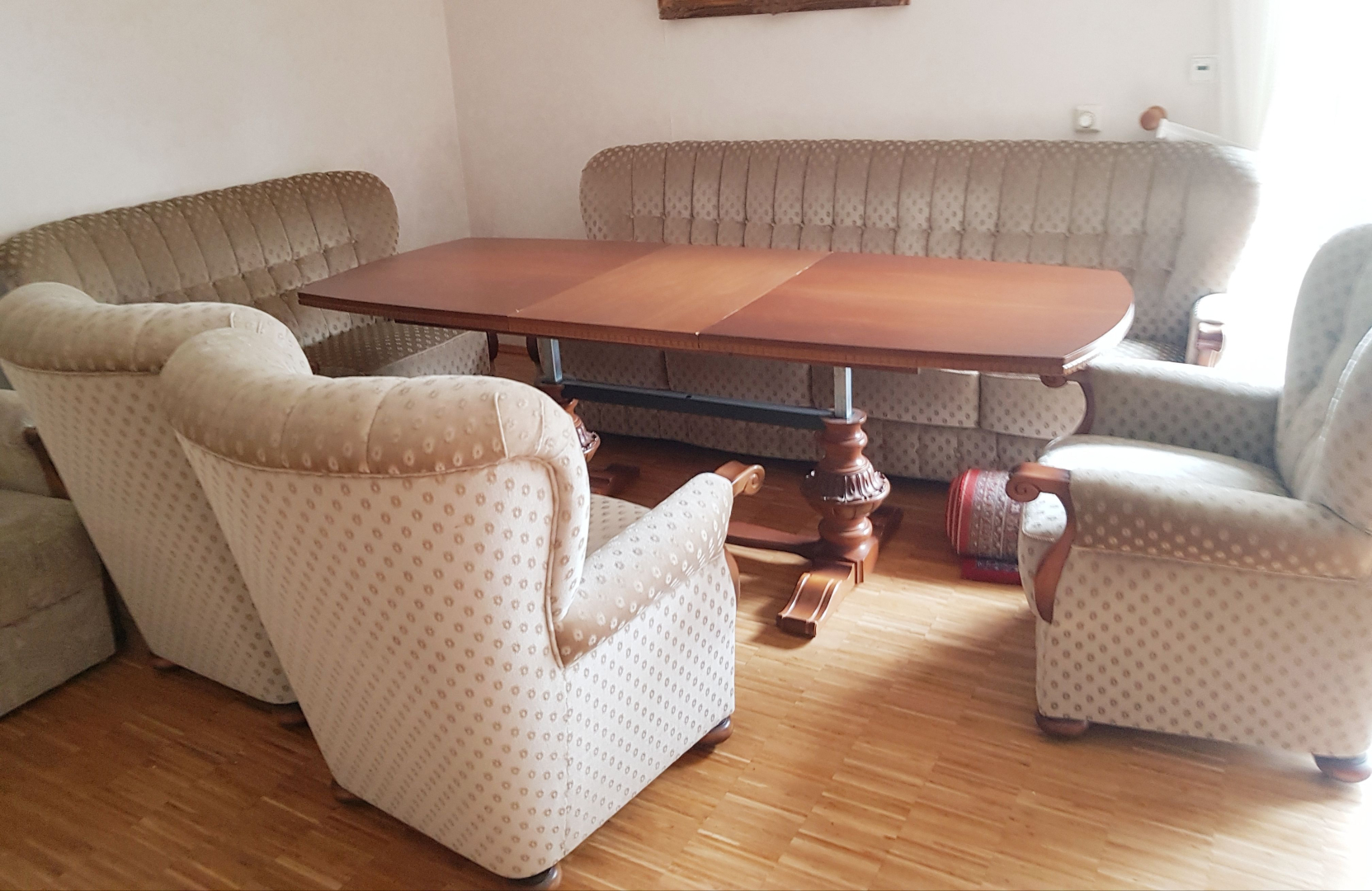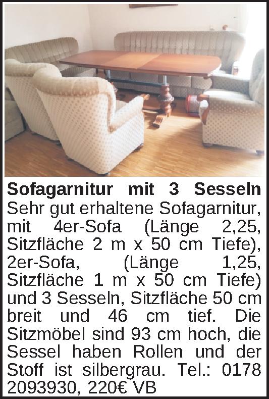 Sehr gut erhaltene Sofagarnitur, mit 4er-Sofa (Länge 2,25, Sitzfläche 2 m x 50 cm Tiefe), 2er-Sofa, (Länge 1,25, Sitzfläche 1 m x 50 cm Tiefe) und 3 Sesseln, Sitzfläche 50 cm breit und 46 cm tief.Die Sitzmöbel sind 93 cm hoch, die Sessel haben Rolle