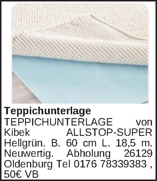 TEPPICHUNTERLAGE von Kibek ALLSTOP-SUPER Hellgrün. B. 60 cm L. 18,5 m. Neuwertig. Abholung 26129 Oldenburg Tel 0176 78339383Kontakt