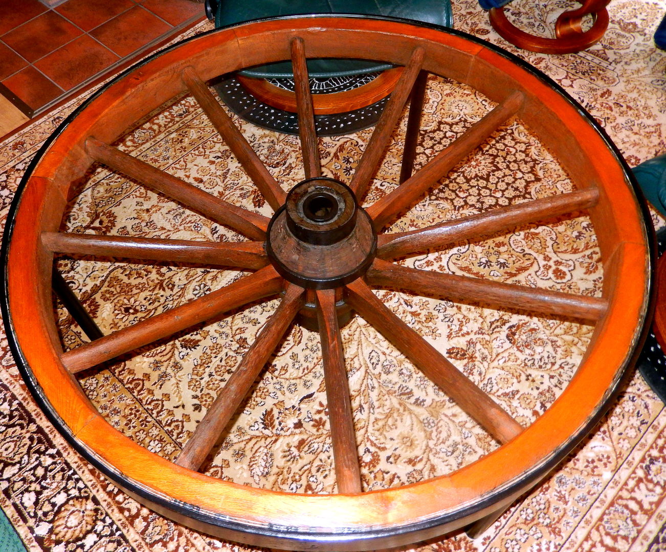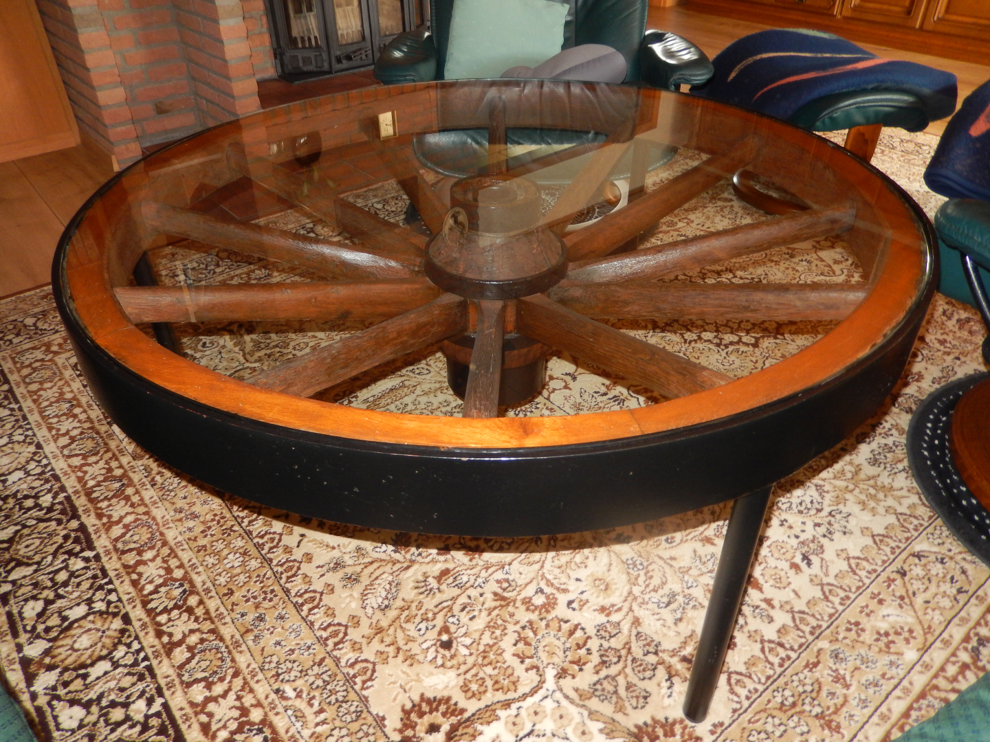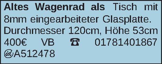 Altes Wagenrad als Tisch mit 8mm eingearbeiteter Glasplatte.Durchmesser 120cm, Höhe 53cm