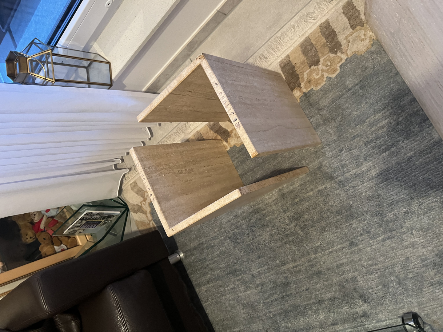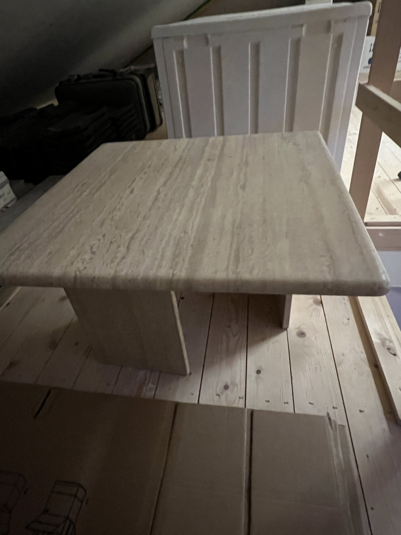 Wir bieten einen sehr gut erhaltenen Tisch aus Travertin an. Er ist rechteckig und hat eine Kantenlänge von ca. 70 cm. Er ist ca. 45 cm hoch. Die Tischplatte liegt auf 2 winkligen, ebenfalls aus Travertin bestehenden Elementen auf. Aufgrund des Materials ist er sehr schwer.