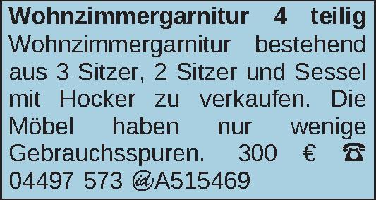 Wohnzimmergarnitur bestehend aus 3 Sitzer, 2 Sitzer und Sessel mit Hocker zuv erkaufen. Die Möbel haben nur wenige Gebrauchsspuren. Tel 04497 573