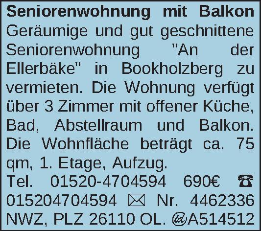 Geräumige und gut geschnittene Seniorenwohnung "An der Ellerbäke" in Bookholzberg zu vermieten. Die Wohnung verfügt über 3 Zimmer mit offener Küche, Bad, Abstellraum und Balkon. Die Wohnfläche beträgt ca. 75 qm, 1. Etage, Aufzug.