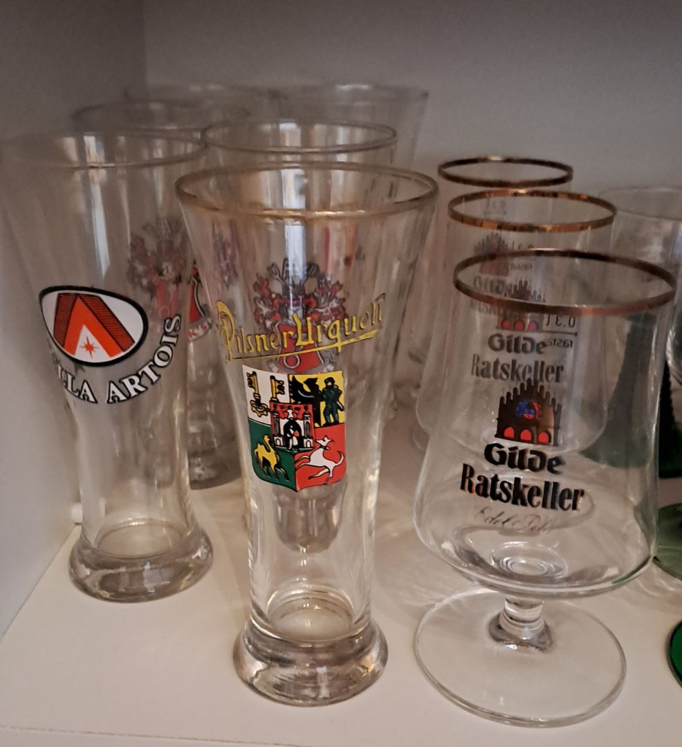 6 Biergläser aus den 70ger. Jahren,versch.Motive.5 Gilde Ratskeller Edel Pils Biergläser 0,3l mit Goldrand,top gepflegt.Privatverkauf, nur Selbstabholung.