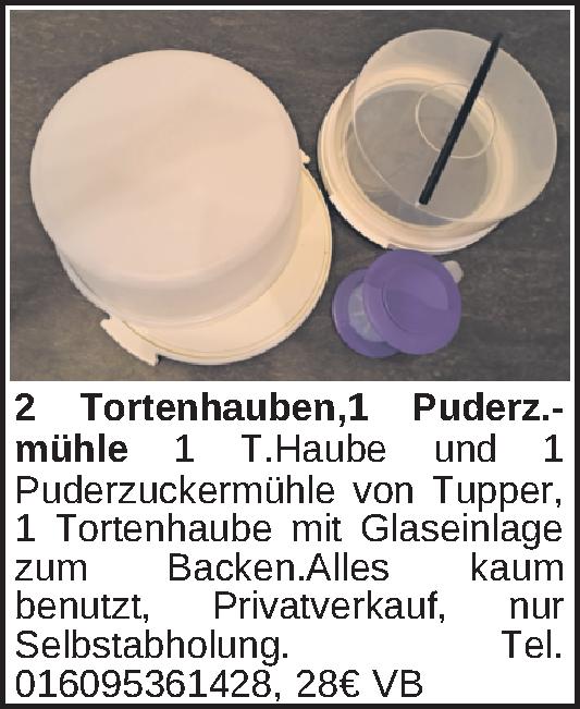 1 T.Haube und 1 Puderzuckermühle von Tupper, 1 Tortenhaube mit Glaseinlage zum Backen.Alles kaum benutzt, Privatverkauf, nur Selbstabholung.Tel. 016095361428