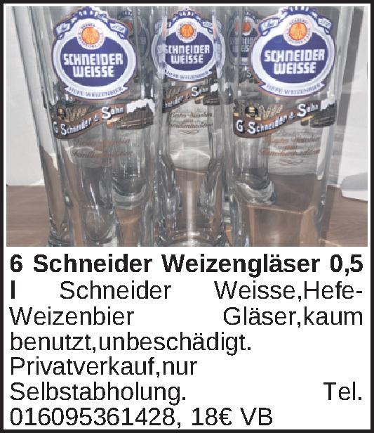 Schneider Weisse,Hefe-Weizenbier Gläser,kaum benutzt,unbeschädigt. Privatverkauf,nur Selbstabholung.Tel. 016095361428