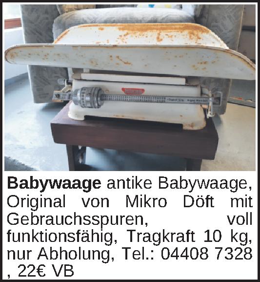 antike Babywaage, Original von Mikro Döft mit Gebrauchsspuren, voll funktionsfähig, Tragkraft 10 kg, nur Abholung, Tel.: 04408 7328Kontakt