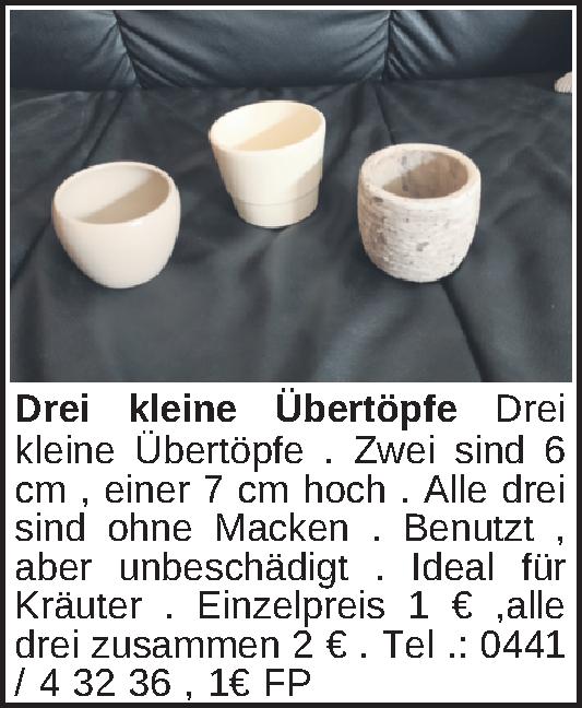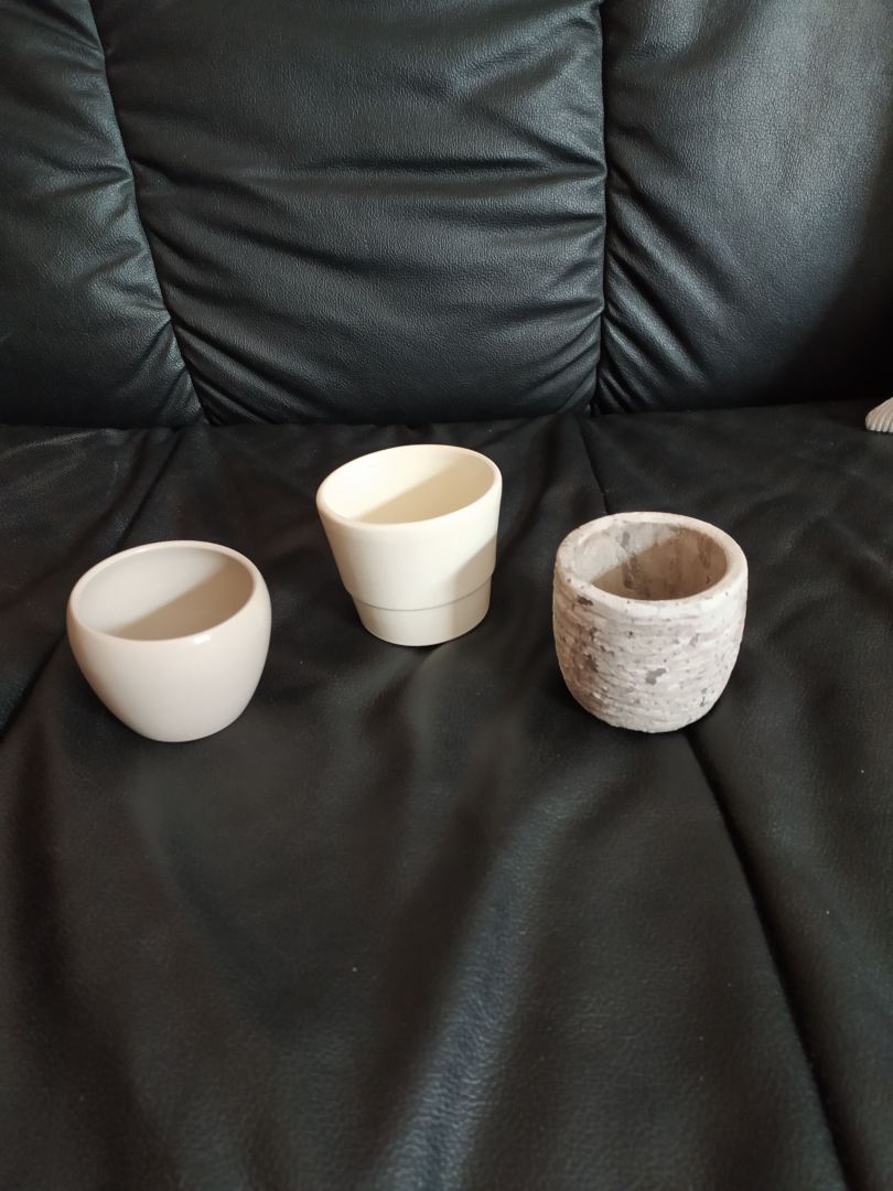 Drei kleine Übertöpfe . Zwei sind 6 cm , einer 7 cm hoch . Alle drei sind ohne Macken . Benutzt , aber unbeschädigt .Ideal für Kräuter . Einzelpreis 1 € ,alle drei zusammen 2 € .