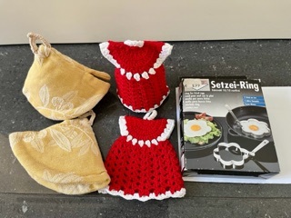 NEU komplett 5€. Eierwärmer ital. Handarbeit aus gelbem leicht gemustertem Baumwollstoff sowie 2 gehäkelte Eierwärmer oder wie wär´s mit einem blumigen Spiegelei zu Ostern? Leicht gemacht mit dem Setzei-Ring (noch in der Originalverp.) Alles für denKontakt