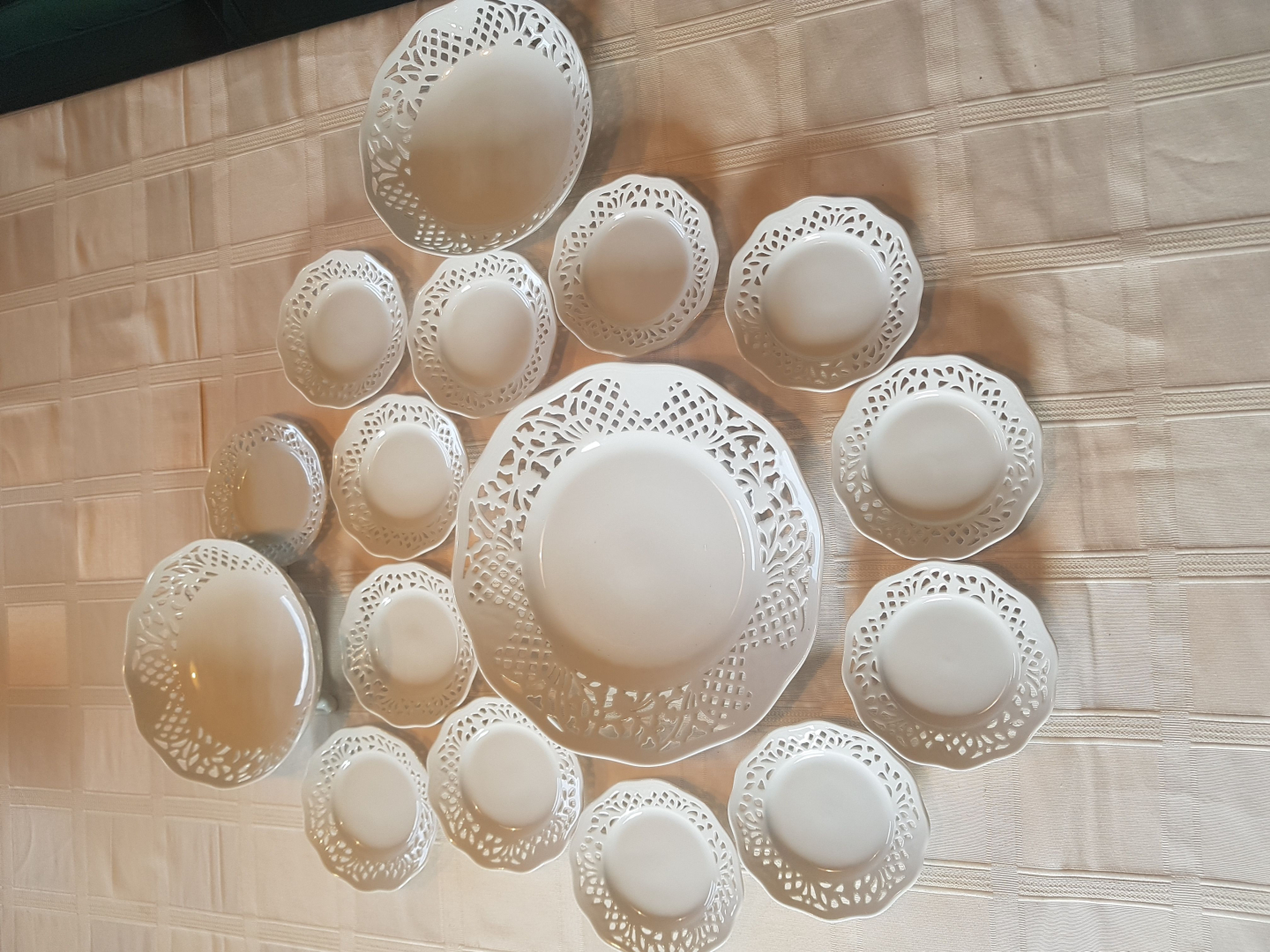 Sehr gut erhaltene Gebäckteller und Gebäckschalen aus weissem Porzellan mit Durchbruchmuster von Schumann, Bavaria.Es sind 13 Gebäckteller, 1 größerer Teller und 2 Schalen, davon eine mit kleinen Füßchen.