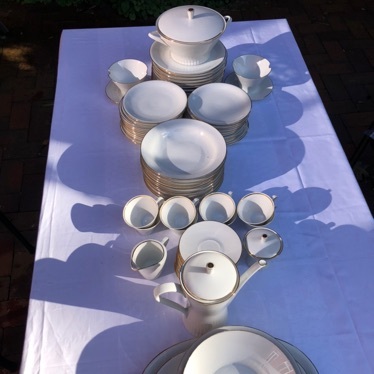 66 Teile, 13 Frühstücksteller, 8 Tassen, elf Untertassen, 1 Sahnekännchen, 1 Zuckerdose, 1 Kaffeekanne, elf große Teller, 12 tiefe Teller, 1 Suppenschüsseln mit Deckel, zwei Servierplatten, 2 Saucieren ( 1 Sauciere und ein tiefer Teller angeschlagen)Kontakt