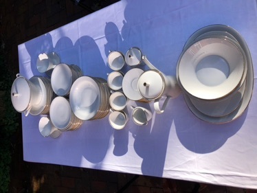 Goldrand,geschirr, 66 Teile: 13 Frühstücksteller, 8 Tassen, 11 Untertassen, 1 Kaffeekanne, 1 Zuckerdose, 1 Milchkännchen, 11 flache Teller, 12 tiefe Teller, 2 Saucieren, drei Schüsseln, Zwei SERVIER Platten, eine Suppenschüssel mit Deckel. Nur SelbstKontakt