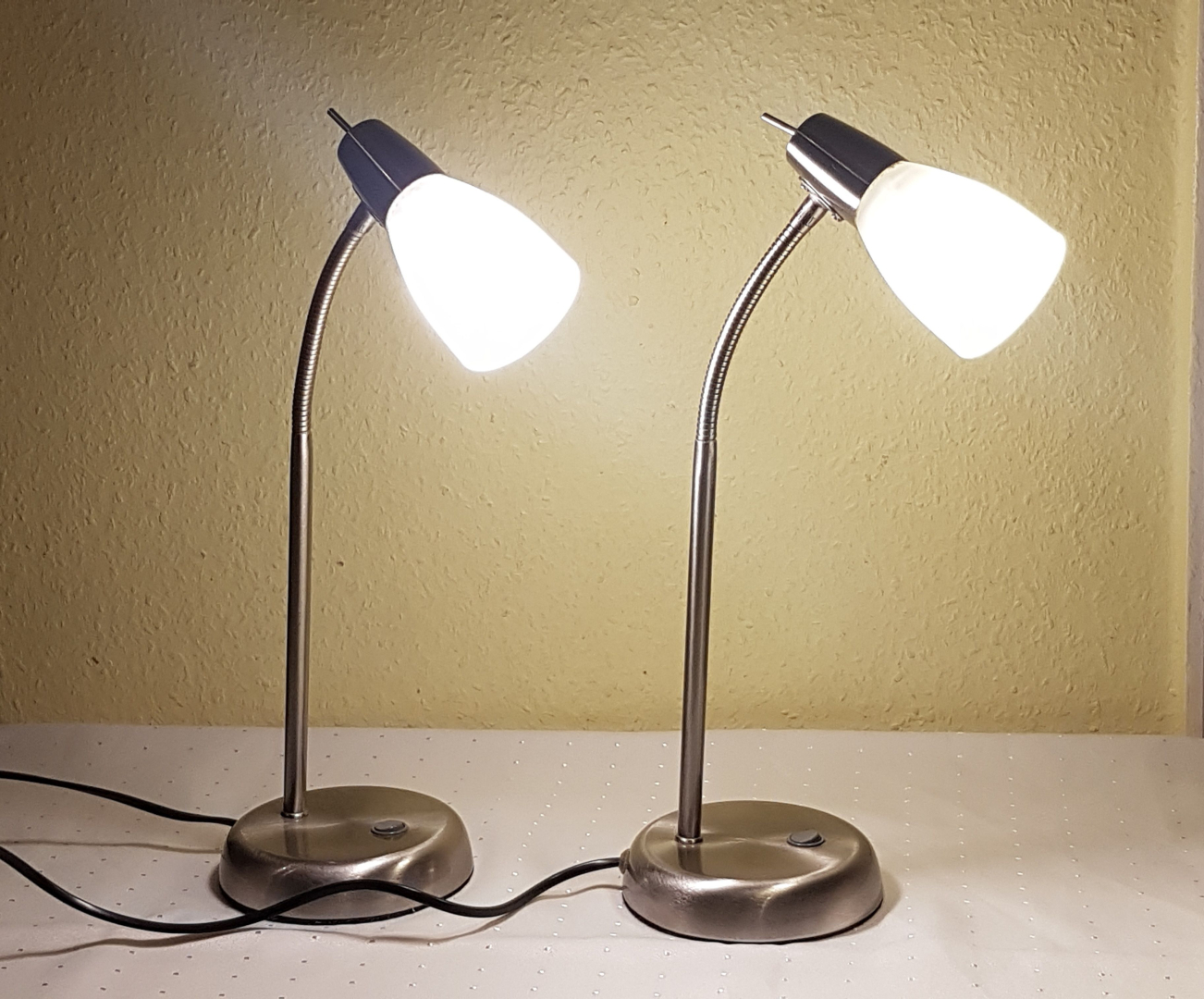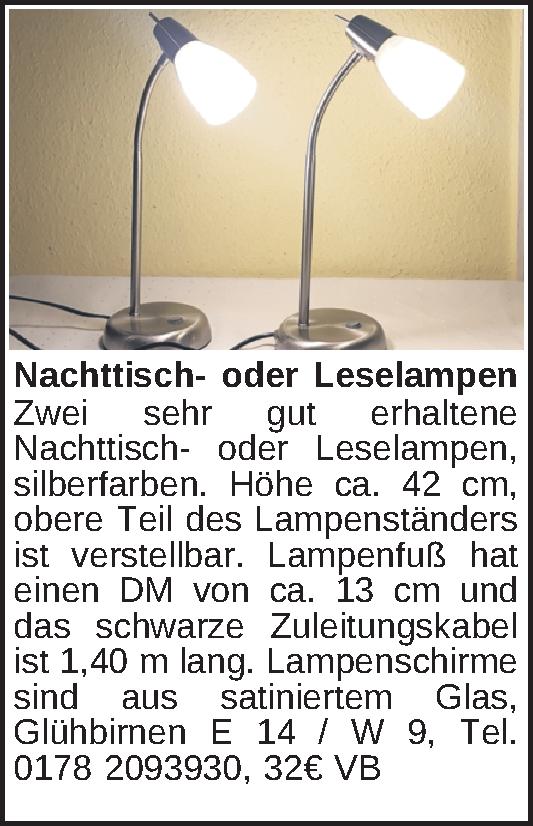 Zwei sehr gut erhaltene Nachttisch- oder Leselampen, silberfarben.Höhe ca. 42 cm, obere Teil des Lampenständers ist verstellbar. Lampenfuß hat einen DM von ca. 13 cm und das schwarze Zuleitungskabel ist 1,40 m lang.