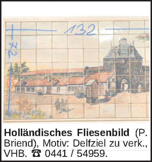 Holländisches Fliesenbild (P. Briend), Motiv: Delfziel zu verk., VHB. ‡ 0441 / 54959.Kontakt