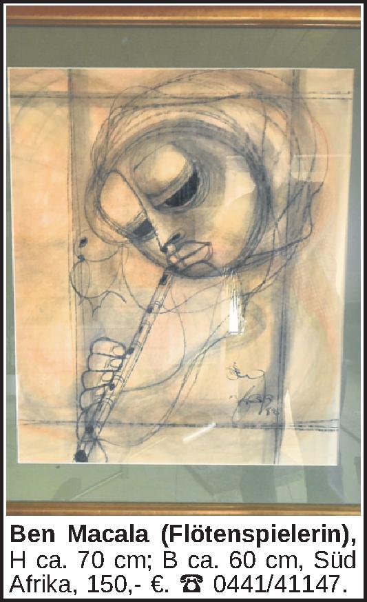 Ben Macala (Flötenspielerin), H ca. 70 cm; B ca. 60 cm, Süd Afrika, 150,- €. ‡ 0441/41147.Kontakt