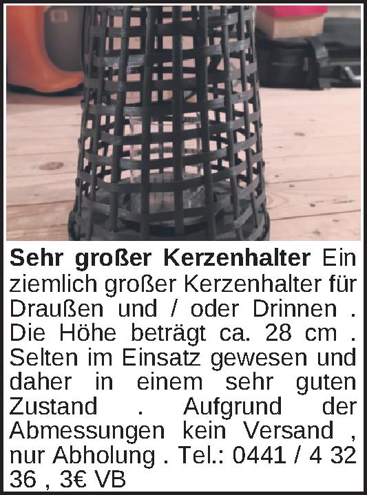 Ein ziemlich großer Kerzenhalter für Draußen und / oder Drinnen . Die Höhe beträgt ca. 28 cm . Selten im Einsatz gewesen und daher in einem sehr guten Zustand . Aufgrund der Abmessungen kein Versand , nur Abholung .Tel.: 0441 / 4 32 36