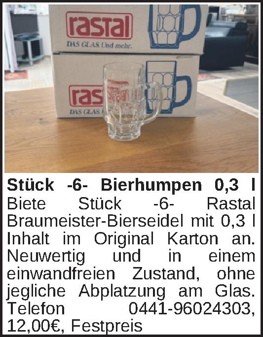Biete Stück -6- Rastal Braumeister-Bierseidel mit 0,3 l Inhalt im Original Karton an. Neuwertig und in einem einwandfreien Zustand, ohne jegliche Abplatzung am Glas. Telefon 0441-96024303