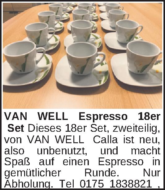 Dieses 18er Set, zweiteilig, von VAN WELL Calla ist neu, also unbenutzt, und macht Spaß auf einen Espresso in gemütlicher Runde. Nur Abholung. Tel 0175 1838821Kontakt