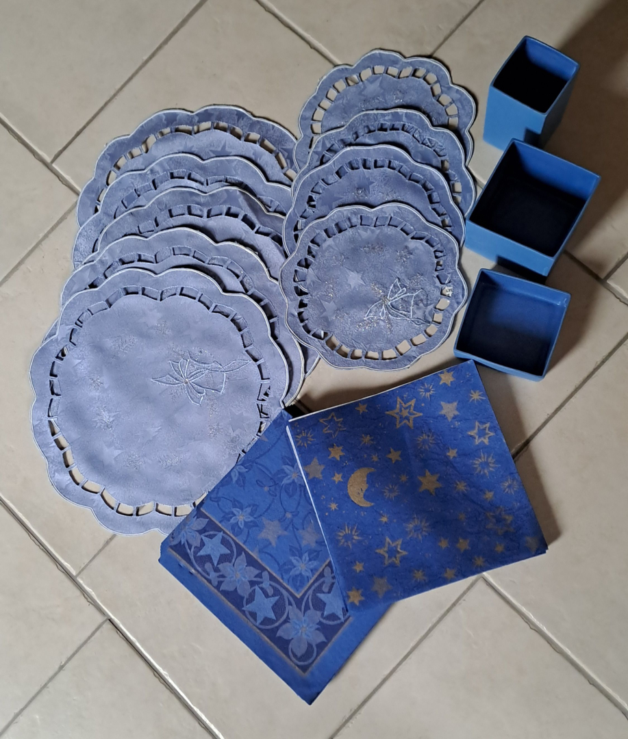 5 Decken 30cm,4 Decken 19cm,18 Papier Servietten20x20 cm Sterne-Blumenmotiv,3tlg.Deko Töpfe Blau.Privatverkauf, top gepflegt.