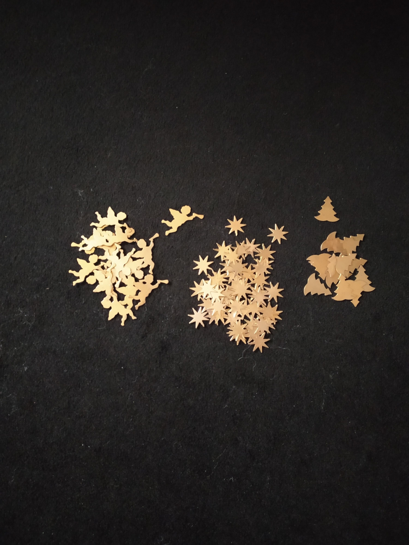 Dekoration für Weihnachten aus Metall . 12 Tannen , 16 Engel und 48 Sterne . Maße : Sterne ca. 2,5 cm , Engel ca. 5 cm lang , Tannen ca 3 cm hoch . Einzelpreise : Tannen 1,50€ , Engel 2,00€ , Sterne 2,50€ , alle zusammen 5 € .