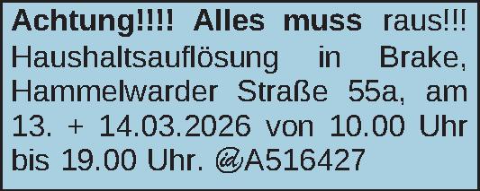 Alles muss raus!!! Haushaltsauflösung in Brake, Hammelwarder Straße 55a, am 13. + 14.03.2026 von 10.00 Uhr bis 19.00 Uhr.