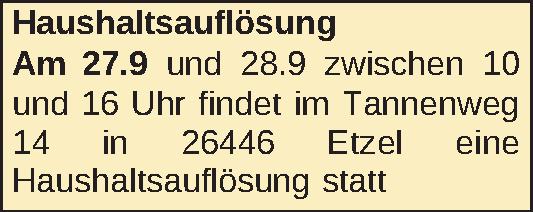 Am 27.9 und 28.9 zwischen 10 und 16 Uhr findet im Tannenweg 14 in 26446 Etzel eine Haushaltsauflösung stattKontakt