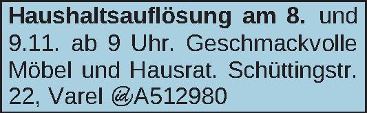 am 8. und 9.11. ab 9 Uhr. Geschmackvolle Möbel und Hausrat. Schüttingstr. 22, VarelKontakt