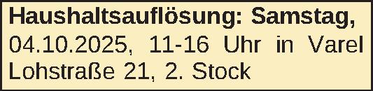 Haushaltsauflösung: Samstag, 04.10.2025, 11-16 Uhr in Varel Lohstraße 21, 2. StockKontakt