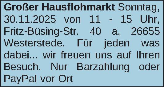 Großer Hausflohmarkt Sonntag, 30.11.2025 von 11 - 15 Uhr, Fritz-Büsing-Str. 40 a, 26655 Westerstede. Für jeden was dabei... wir freuen uns auf Ihren Besuch. Nur Barzahlung oder PayPal vor OrtKontakt
