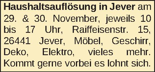 Haushaltsauflösung in Jever am 29. & 30. November, jeweils 10 bis 17 Uhr, Raiffeisenstr. 15, 26441 Jever, Möbel, Geschirr, Deko, Elektro, vieles mehr. Kommt gerne vorbei es lohnt sich.Kontakt