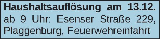 Haushaltsauflösung am 13.12. ab 9 Uhr: Esenser Straße 229, Plaggenburg, Feuerwehreinfahrt