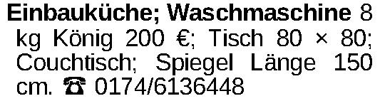 Einbauküche; Waschmaschine 8 kg König 200 €; Tisch 80 × 80; Couchtisch; Spiegel Länge 150 cm. 0174/6136448