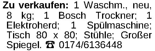 Zu verkaufen: 1 Waschm., neu, 8 kg; 1 Bosch Trockner; 1 Elektroherd; 1 Spülmaschine; Tisch 80 x 80; Stühle; Großer Spiegel. ‡ 0174/6136448Kontakt