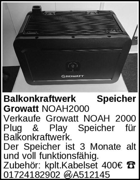 Verkaufe Growatt NOAH 2000 Plug & Play Speicher für Balkonkraftwerk.Der Speicher ist 3 Monate alt und voll funktionsfähig.