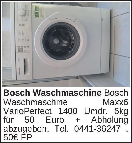Bosch Waschmaschine Maxx6 VarioPerfect 1400 Umdr. 6kg für 50 Euro + Abholung abzugeben. Tel. 0441-36247Kontakt
